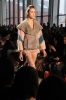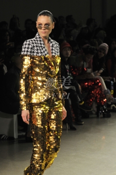 Chris Habana’s playful party accessories — 14-karat gold party horn/glow-stick-holder necklaces and sequin party hats — topped off looks from lamé party dresses to cropped hoodies and sweats with bedazzled tassels; there was even a fur coat with a neon-light heart fastened like a brooch. A green PVC coat and red sequin trenchcoat were the best additions to the playful lineup.